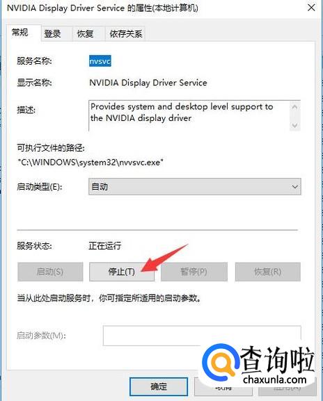双击打开之后,我们就可以看到NVIDIA Display Driver Service的属性了。服务状态显示的是正在运行,如果点击“停止”,就可以关闭NVIDIA设置了。