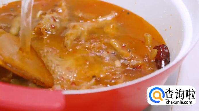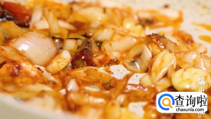 再放入花椒、香叶、干辣椒、豆瓣酱,煸出红油。