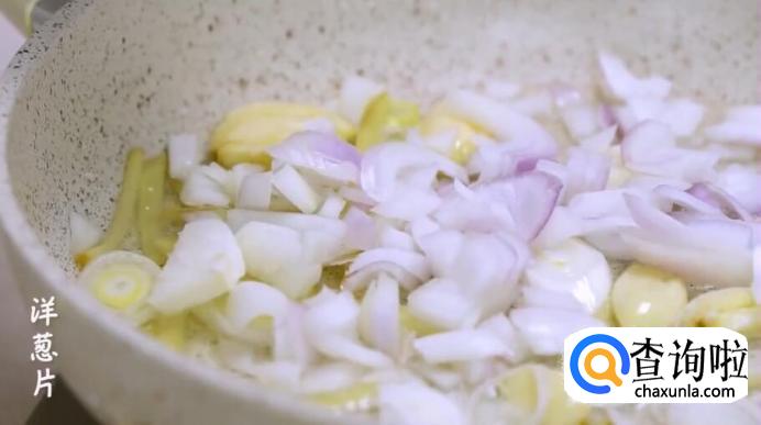 开小火,热锅凉油,放入葱段、姜丝、蒜瓣、洋葱片。