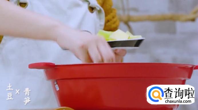 放入配菜土豆和青笋、小米辣,再盖上盖子煮10分钟。