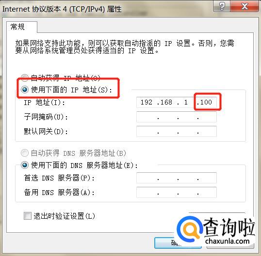选择使用下面的ip地址,即手动获取ip地址。填入图中类似的ip地址。其中100可以填成是其他的2-254之间的数。