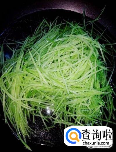 然后我们起锅烧水,把青萝卜丝放入热水锅中焯一下捞出,过凉
