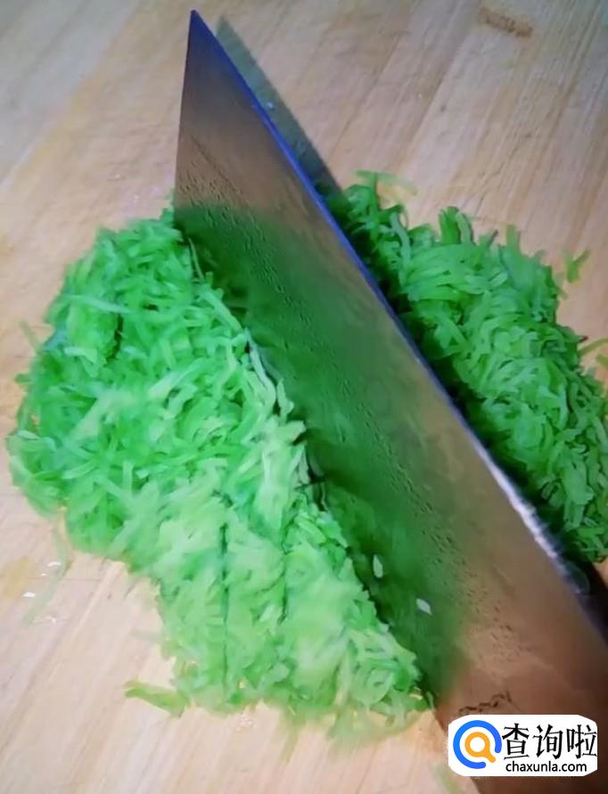 然后我们把焯好的青萝卜丝用刀剁碎,放入盆中