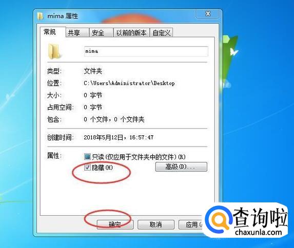 在属性窗口下方找到【属性】,选择【隐藏】选项,即可将文件夹隐藏起来,如下图所示: