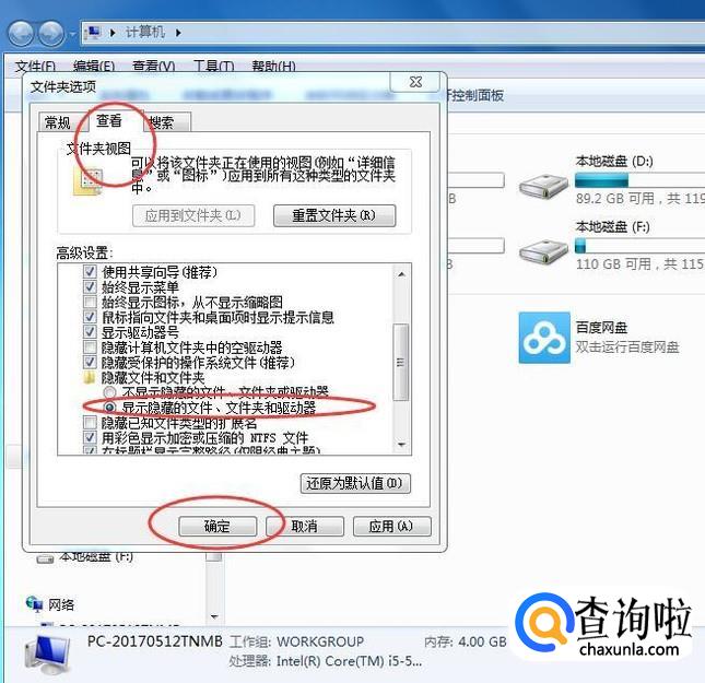 如果想要查看隐藏起来的文件,则可以弹出【文件夹选项】,在查看选项卡中找到【显示隐藏的文件、文件夹即可,如下图所示:
