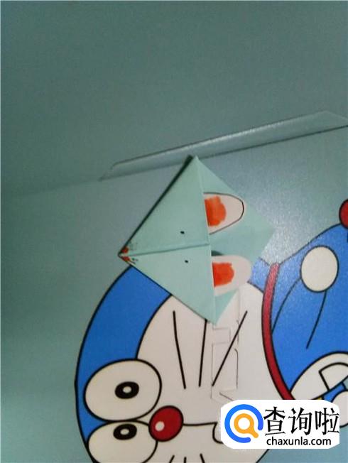 最后,将之前剪好的老鼠耳朵粘在上面,再画好老鼠的嘴巴,眼睛和胡须。这样一个可爱的老鼠书签就折好了。
