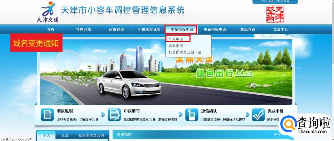 首先登录【天津市小客车调控管理信息系统】的官网,点击首页的【增量指标申请】,有三个选择:个人、企业或社会团体。我们以“个人”申请为例。