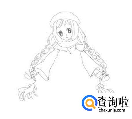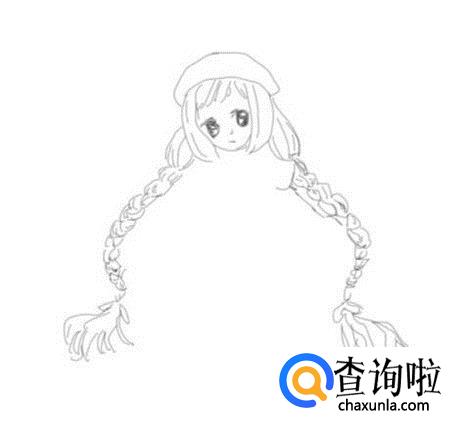 再在头发的两侧再画出女孩的两条长长的大辫子,如图所示: