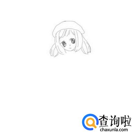 首先画出女孩的帽子,在帽子的下面画出女孩的头发,然后再画出女孩的面部,并在面部上画出女孩的额眼睛鼻子和嘴巴,如图所示: