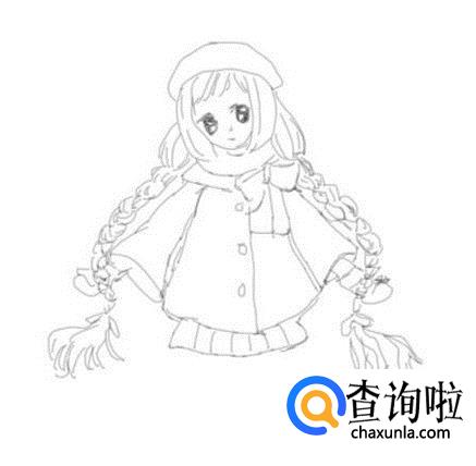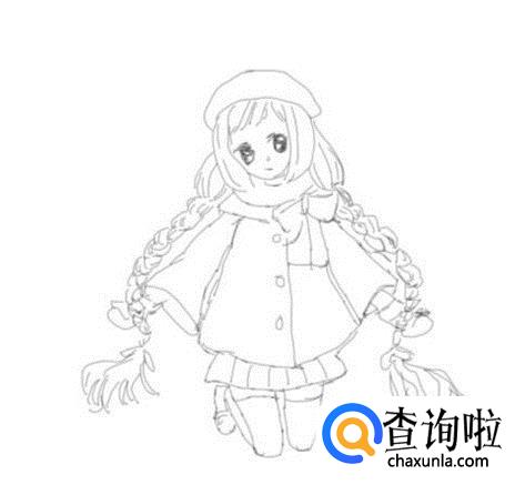 再在身体下面画出女孩的两条腿及脚部,这样二次元的双麻花辫的萌系女孩子就画好了,如图所示:
