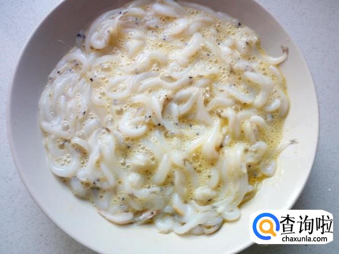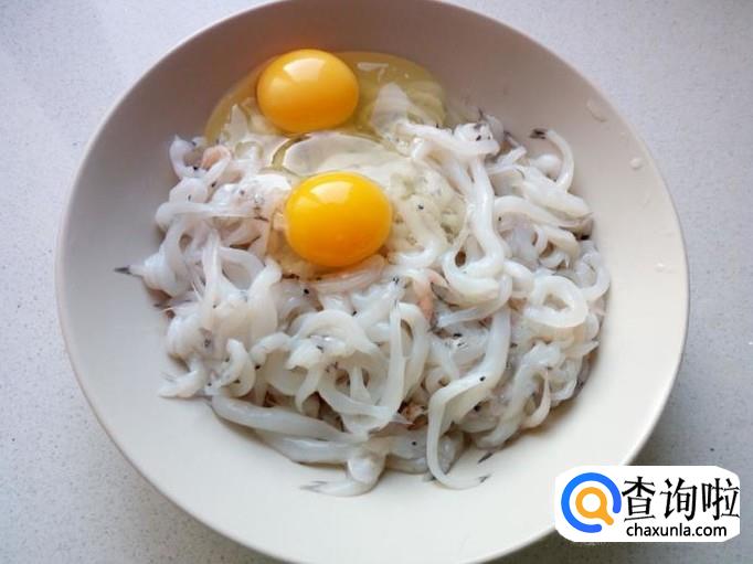 把鸡蛋打入装银鱼的盘中,拌和均匀。