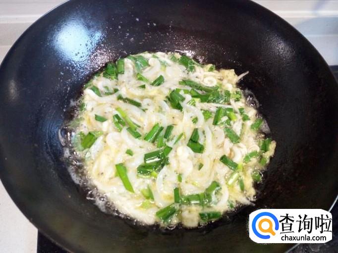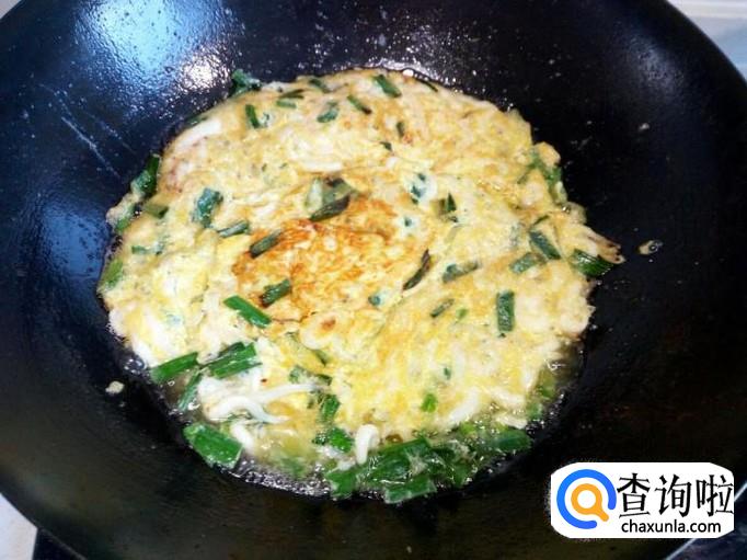 锅内放入油加热,油热后放入银鱼鸡蛋液,小火煎塌。