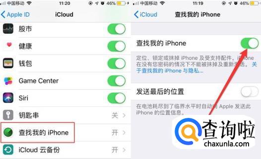 操作步骤:打开“设置”,点击“iCloud”,选择“查找我的iPhone”,然后点击勾选,如下图所示。