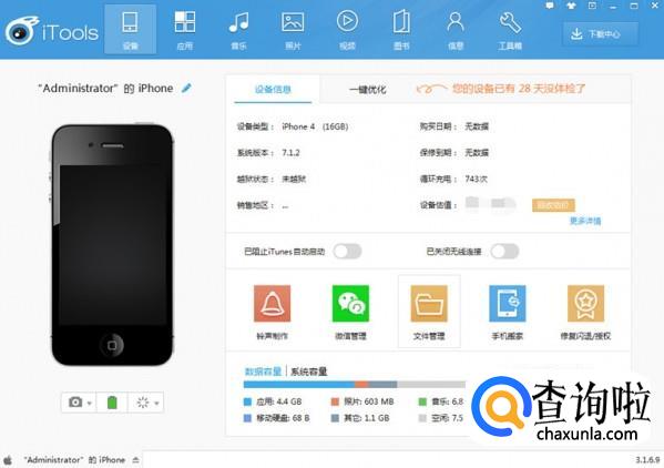 使用苹果iTunes软件进行鉴别真假。在电脑上下载itunes,或者爱思助手,开启iTunes软件,然后用数据线连接手机和电脑,然后就可以点击显示苹果手机图标进入里面。