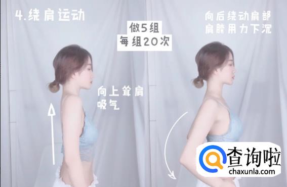 绕肩运动:向上耸肩,缓缓打开肩膀,向后绕动肩部,肩膀用力下沉,会感受到斜方肌的拉伸,做5组每组20次(这是提升颈部肌肉力量的好办法,要勤加练习才有收获哦)。