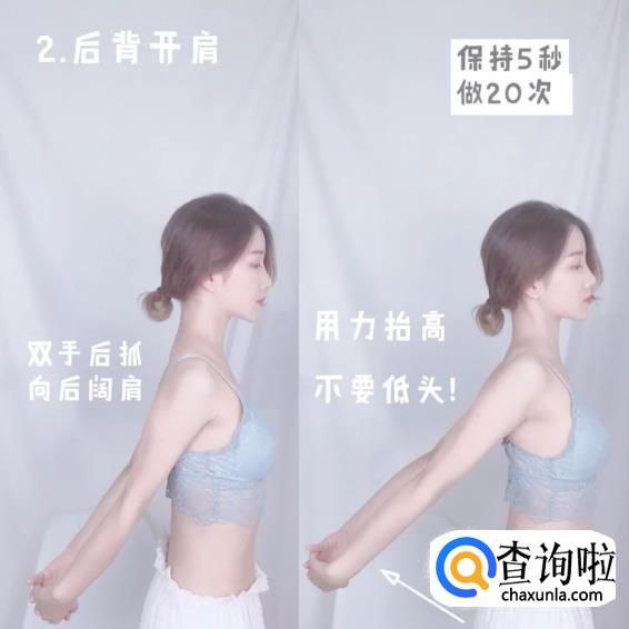 后背开肩:双手后抓,向后阔肩并抬高双手,用力抬高!直至锁骨形成一字。做20次,可以分2组(这个放松肌肉,促进血液循环)。
