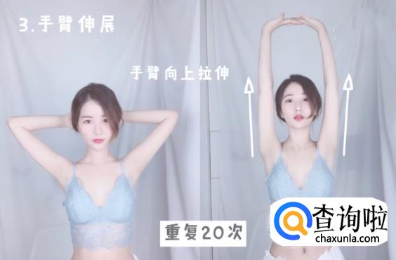 手臂伸展:抬头挺胸收腹,双臂由后脑勺向上拉伸,感受脊柱的拉伸力,保持5秒,这个动作可以改善驼背圆肩,重复20次(这个动作可以让平时紧张的肩颈部放松)。