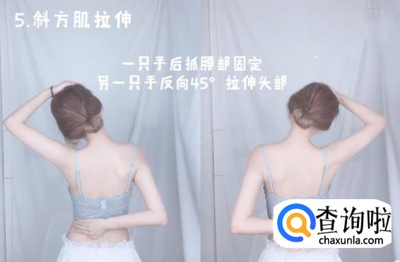 斜方肌拉伸:用手后抓向反方向的腰部固定后,用另一只将头部45度拉伸,保持5秒,做10组(用头尖牵引着颈椎向斜上方提拉,不要向地面压,否则结果会适得其反)。