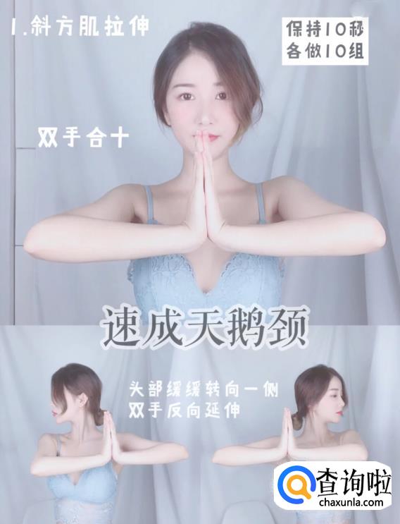斜方肌拉伸:双手在胸前合十,头部缓缓转向一侧,慢吐慢吸,每侧保持十秒,各做十组(动作要慢,总是伸展或收缩到极限,暗示自己有着漂亮的“天鹅”颈)。