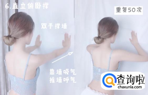 直立俯卧撑:双手撑墙,双手距离比肩宽,靠墙吸气,推开呼气,一天50次(这个动作可以让肩颈部的后背放松)。