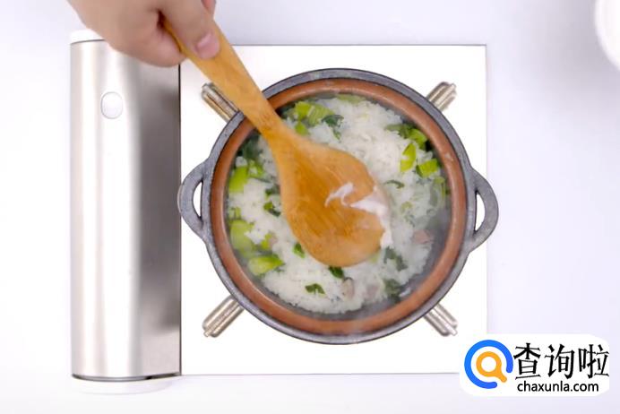 米饭咸肉煮熟后,将青菜加入进去,拌进饭里。
