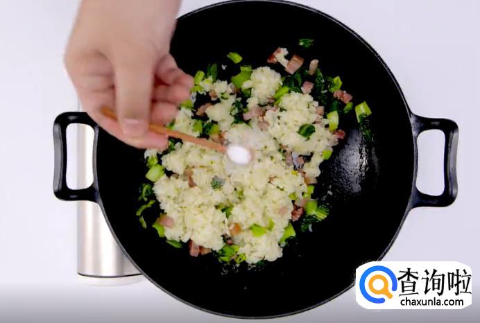 炒散后,将青菜咸肉倒进锅里,然后加入适量的盐,一起翻炒均匀。