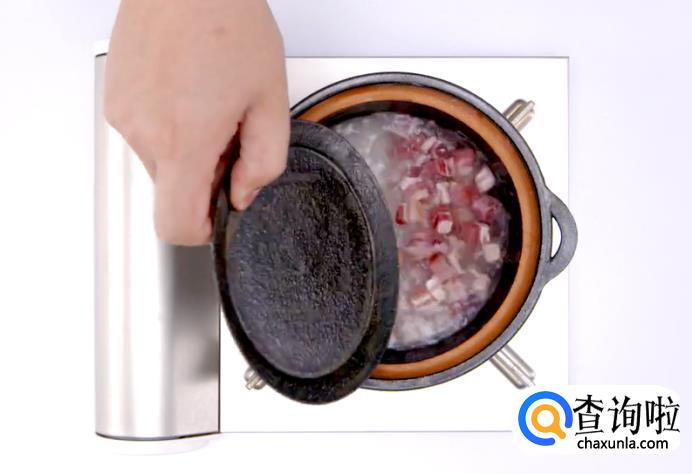 将泡好的米和咸肉丁混合在一起,然后盖上锅盖,开火煮熟。