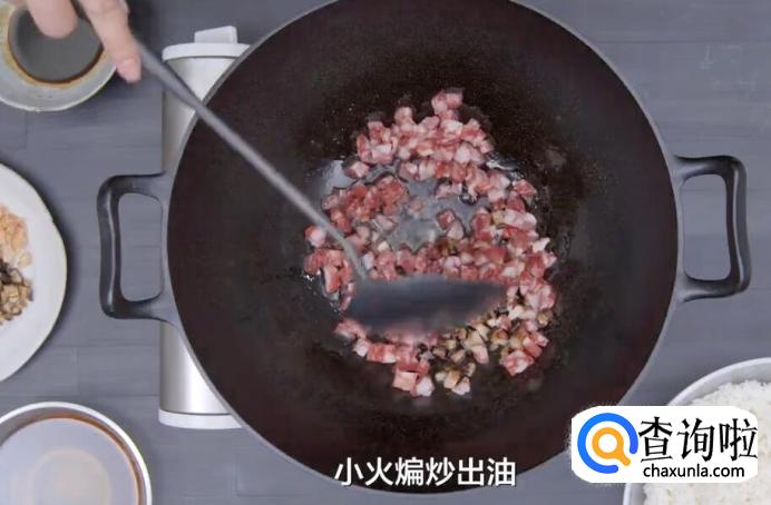 放入腊肠和腊肉丁,小火煸炒出油。