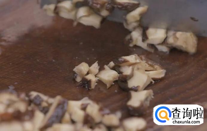 干香菇泡发后,去缔切成小粒,香菇水备用。