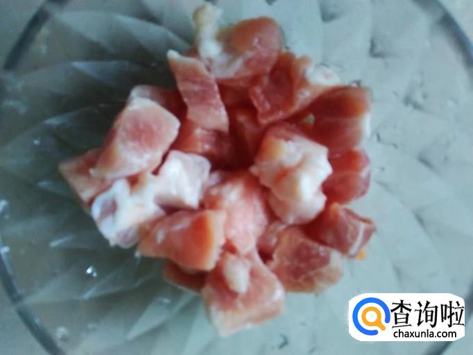 瘦肉切成小丁,加适量的盐、生抽、料酒腌制几分钟。