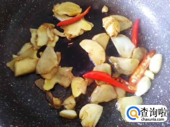 开火下油,放蒜、姜片、小米辣进去加适量的盐翻炒一下,然后下小半勺生抽进去。