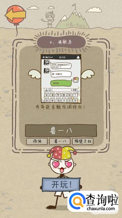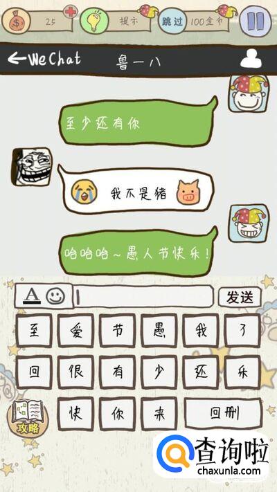 第四关的要求是猜歌名,这里你大致可以根据下面文字就能猜出歌名,在对话框里输入“至少还有你”然后点击发送就可以通关了哦