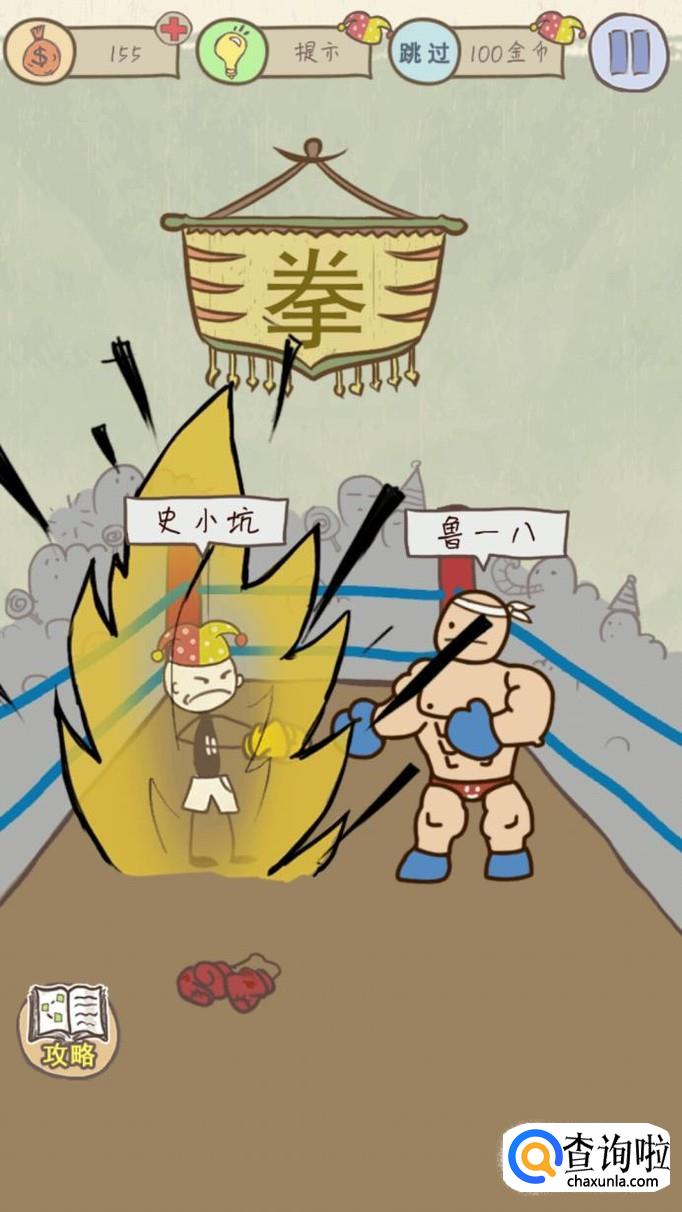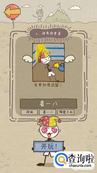 第六关的要求是神奇的拳套,直接捡起地上的红拳套打不赢鲁一八,所以我们要找一个无敌的拳套,点击上方的旗帜,会掉落下来一个黄色的拳套,然后戴上黄拳套,点击史小坑,鲁一八就会被打然后我们就通关了