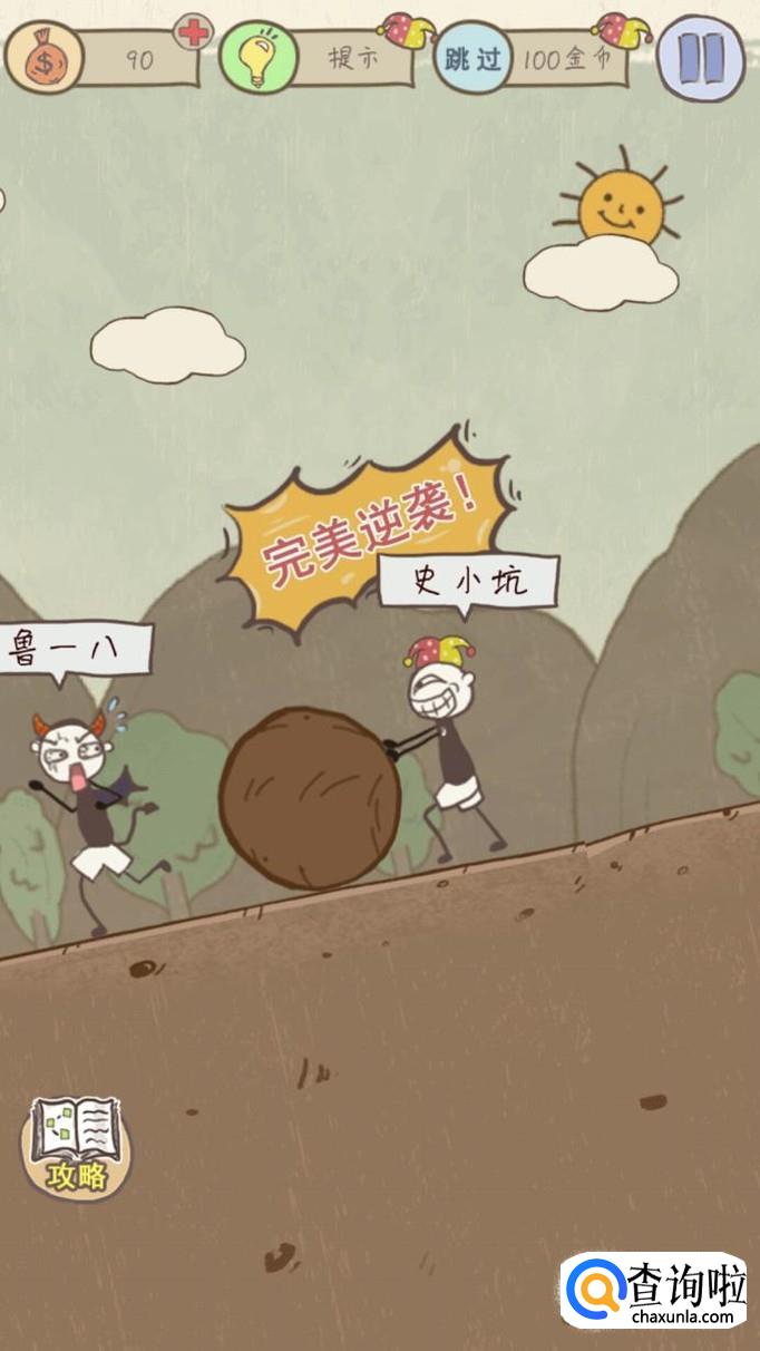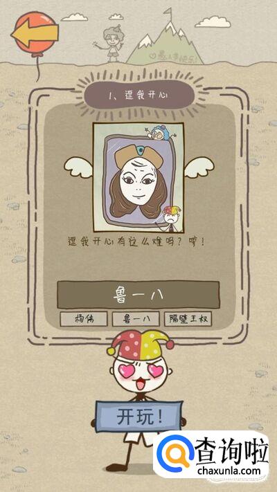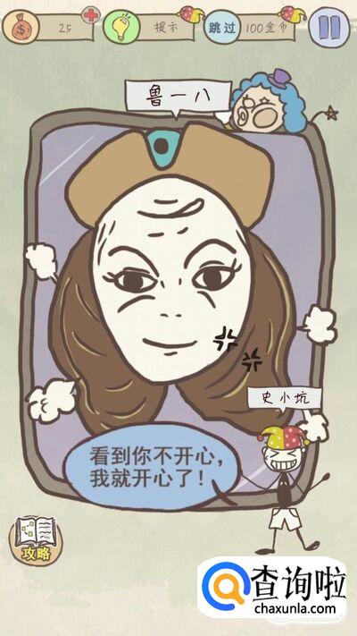 第一关的要求是逗我开心,小伙伴们要明白逗我开心的“我”到底是谁,这里的“我”是史小坑哦,所以只要鲁一八不开心史小坑就开心了,将手机屏幕倒过来,然后在鲁一八的脸上画一个笑脸的弧度就通关了哦