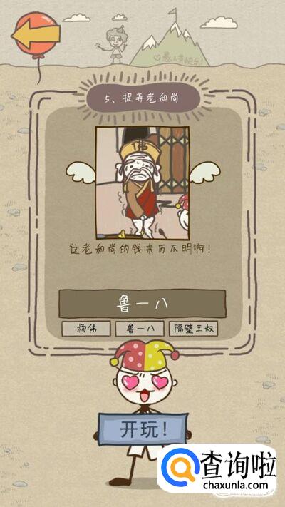 第五关的要求是捉弄老和尚,直接拿桌子上的钱会被老和尚打,所以我们要乘老和尚不注意的时候去拿,一直给老和尚倒茶,老和尚茶喝多了就会去上厕所,在他去上厕所的时候我们就可以把钱拿走这样我们就通关了哦