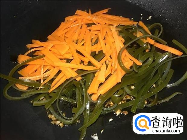 把所有配料搅拌均匀,然后把烫好的红萝卜和海带丝一起倒入锅中,用筷子搅拌均匀。