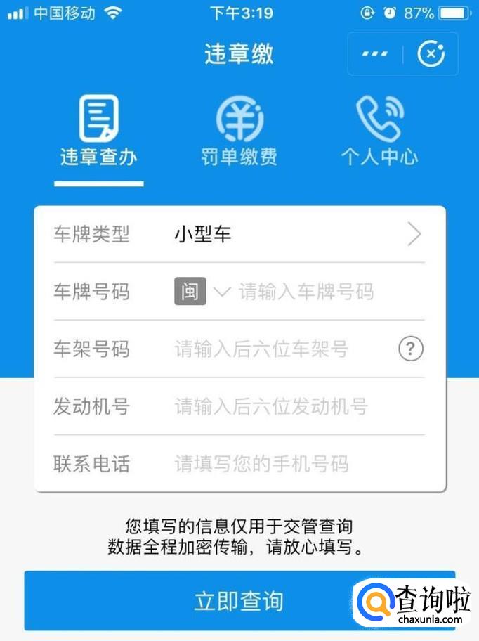 然后我们点击进入,根据上面的信息填入就可以查询了,如果有违章的话,也可以直接点击罚单缴费。