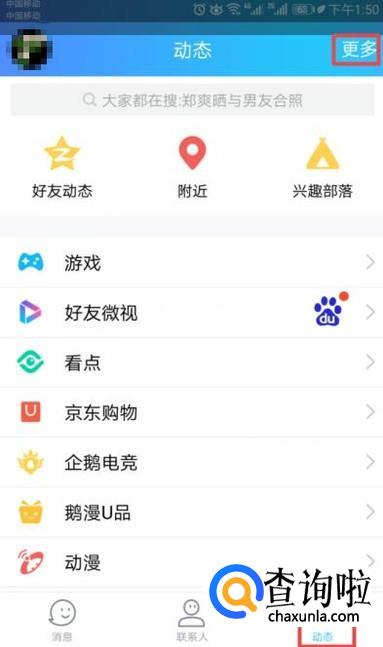 首先,我们打开我们的QQ,然后我们点击右下角的动态,之后我们点击更多;