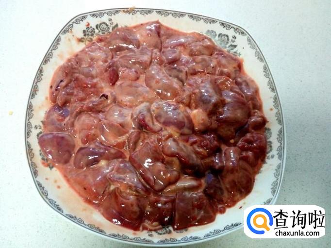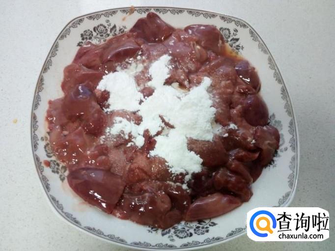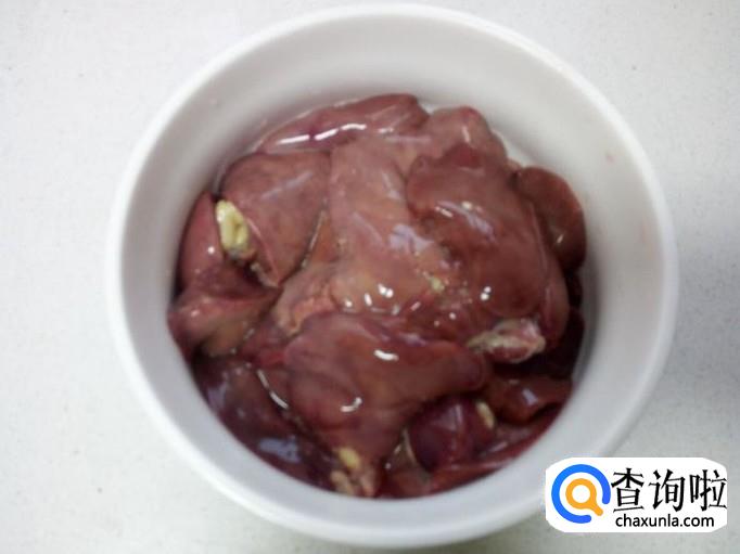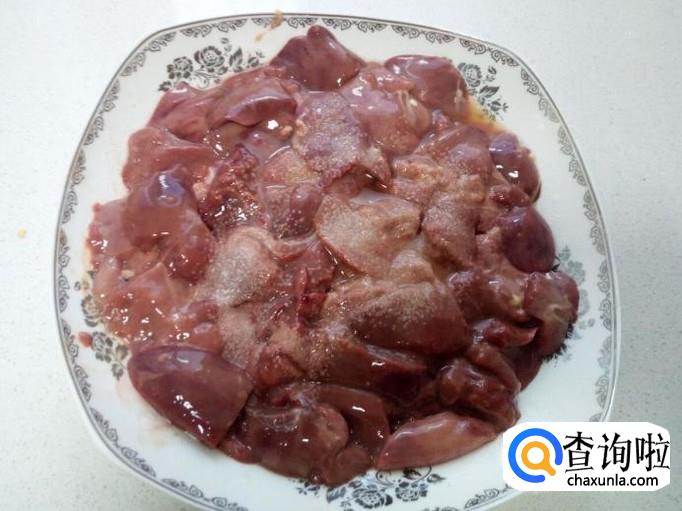 鸡肝用水清洗干净,控干水分,切成块。放入少许盐,五香粉,料酒。