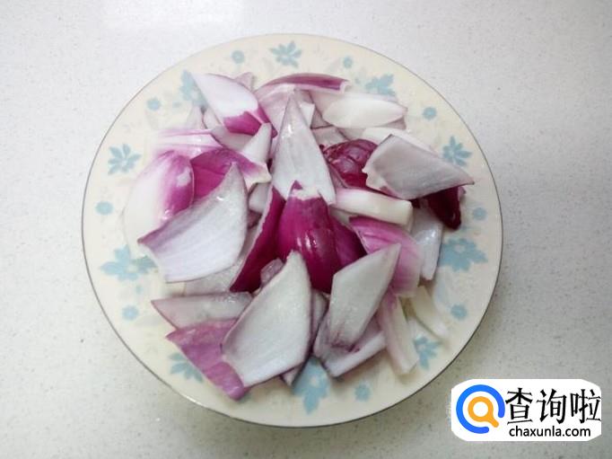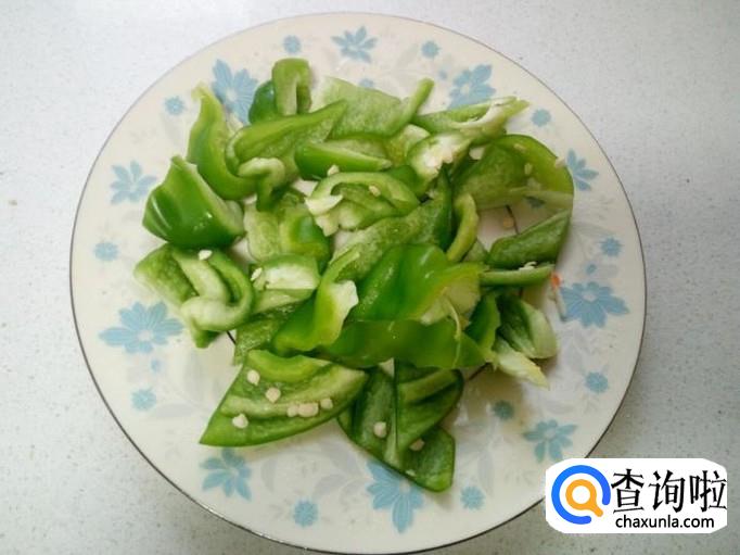 圆葱去皮,用水清洗干净,控干水分,切成片。青椒用水清洗干净,控干水分,切成片。