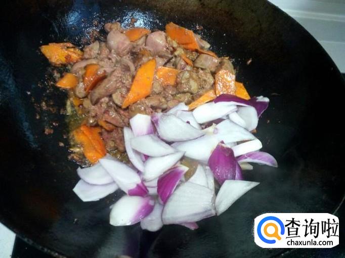 炒至鸡肝表面坚挺后,放入圆葱,放入盐,翻炒至圆葱断生。