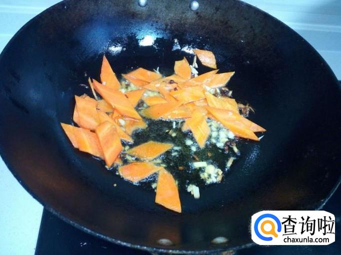 锅内放入油加热,油热后放入花椒,葱,姜,蒜,爆锅,然后放入胡萝卜片炒至变软。