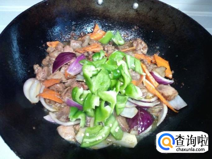 放入青椒,略翻炒一下,放入味精,关火出勺。