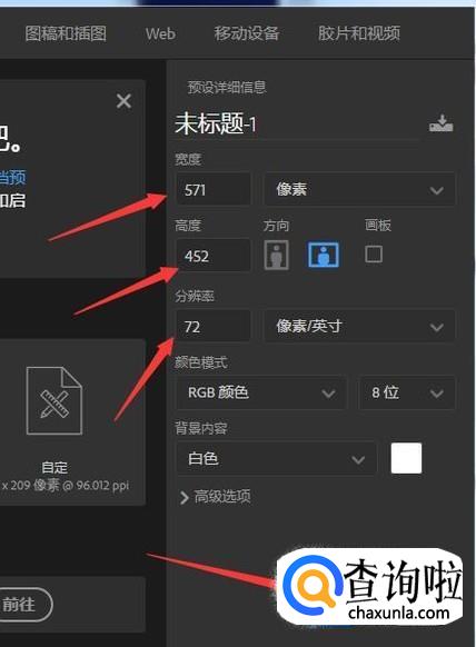 接下来看看如何创建一个文件,点击文件菜单的新建。在右侧输入宽度,高度,分辨率,点击创建。