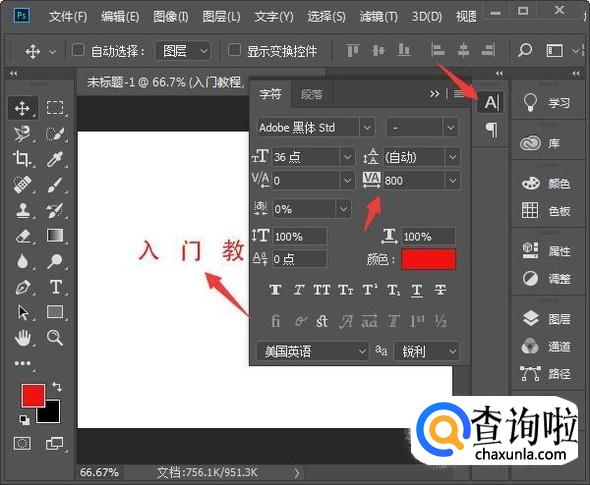 在白色文件中点击,输入文字。再点击右侧的字符面板,把字距调300,如图。