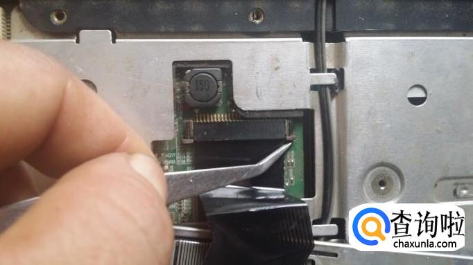 这是可以看到键盘是通过一根排线连接到主板上的,用镊子小心的把固定排线的卡扣推出,就可以取下键盘了。