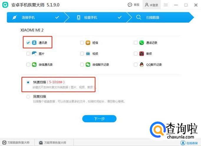 软件连接手机成功后选择要的数据类型,勾选通讯录,还可以选择快速扫描或者是深度扫描,如果是手机通讯录恢复,可以选择快速扫描就可以的。