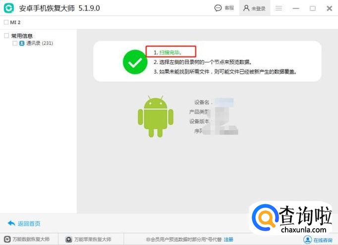 在扫描的时候要保存数据线接触良好,并耐心等待扫描结束。一般手机内存不大的话,扫描是很快就可以完成的。