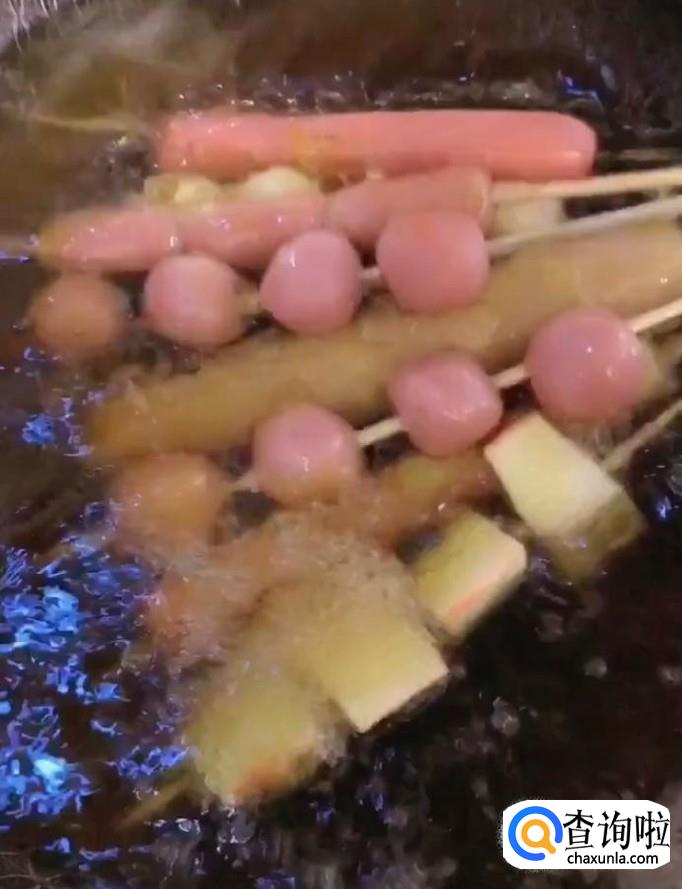 接着我们在锅中放入适量的油,把油烧至六成热,先下入麻辣烫与火腿肠,炸好捞出,再放入青菜,炸好捞出备用
