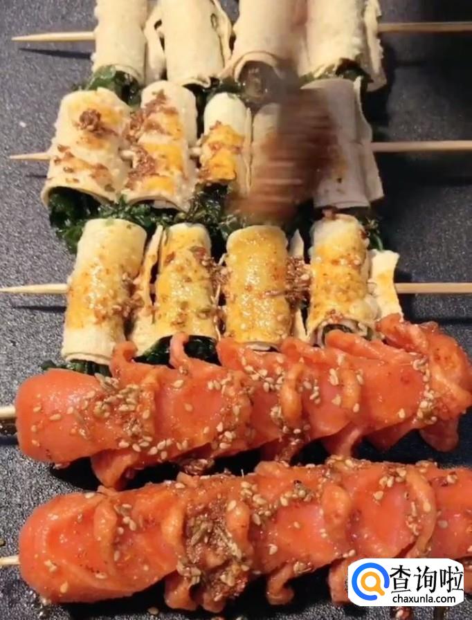 豆腐皮,青菜,麻辣烫,火腿肠,竹签,芝麻,孜然粉,辣椒面,烧烤料,食用油,盐